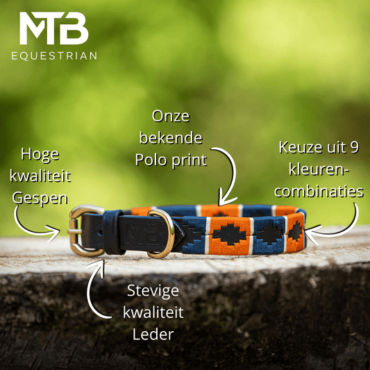 Leren Polo Honden Halsband Oranje Blauw – Handgemaakt & Verstelbaar – MTB Equestrian